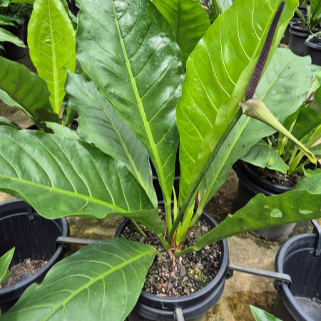 Anthurium schlechtendalii, commonly known as the Giant Laceleaf, is a spectacular tropical plant celebrated for its large, deeply lobed leaves that resemble intricate lace. This impressive Anthurium species adds a touch of drama and elegance to indoor spaces. With its sturdy upright stems and glossy, dark green foliage, it becomes a striking focal point in any collection of houseplants. Anthurium schlechtendalii is relatively low-maintenance, requiring bright, indirect light and well-draining soil. Elevate your interior decor with the grandeur of Anthurium schlechtendalii.